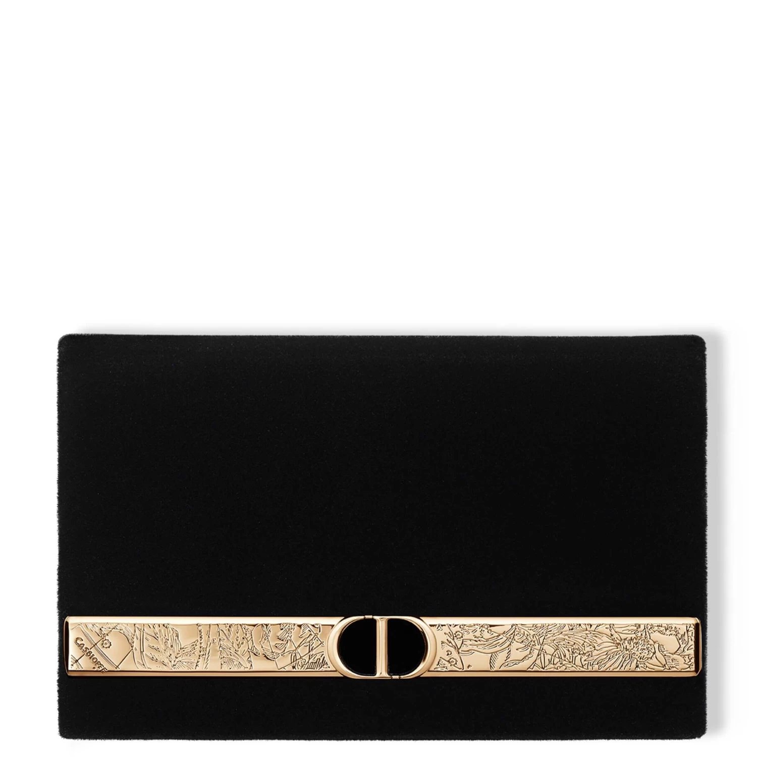 Dior crea una paleta de maquillaje de ojos cuyo espíritu evoca el de un cofre couture: el estuche de la paleta de ojos se realza con una barra dorada con un motivo celeste y flores doradas.
