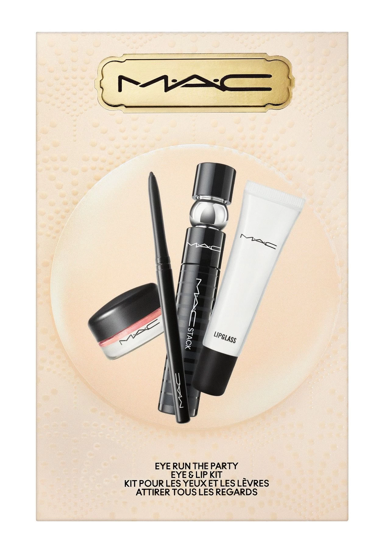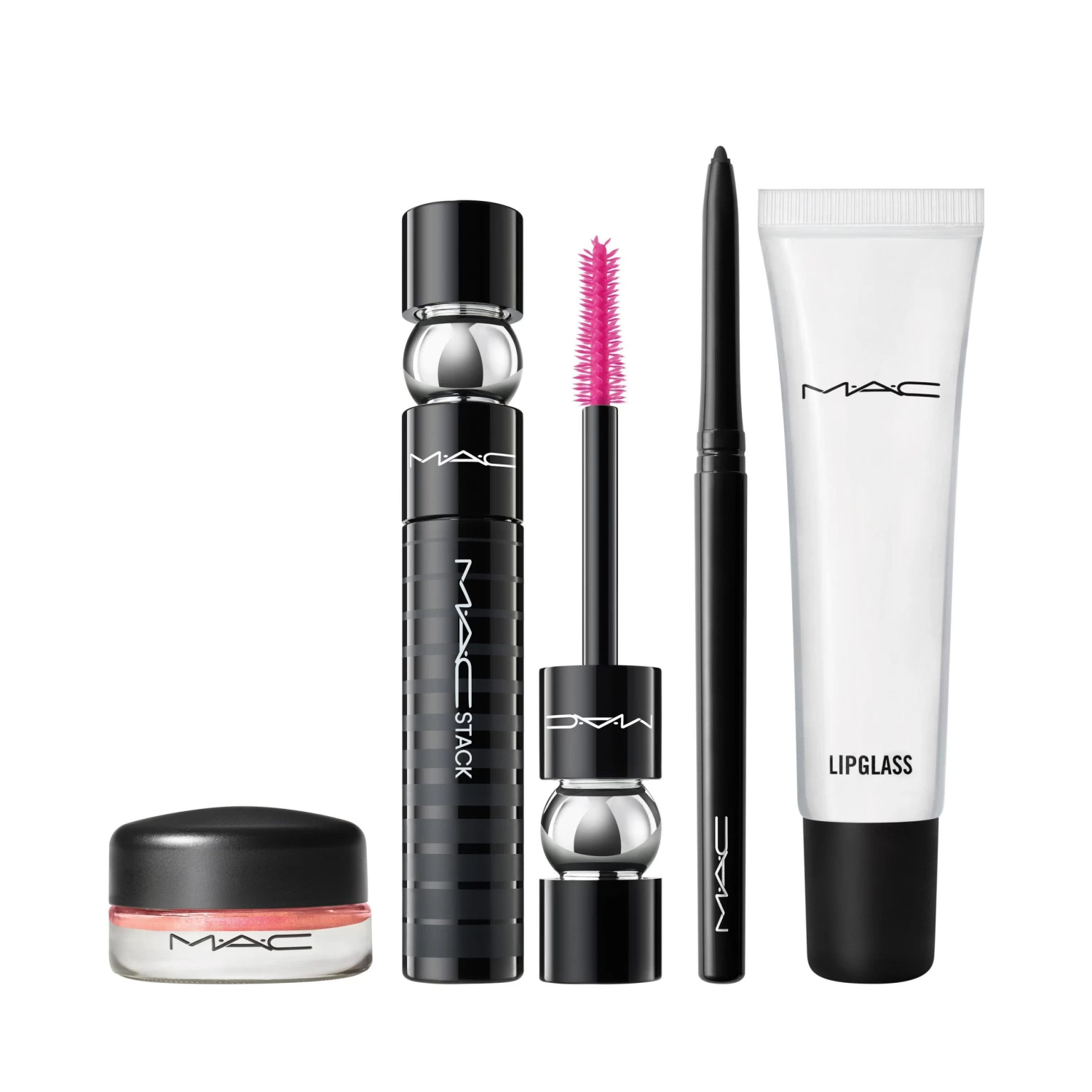 Una kit de edición limitada de cuatro piezas para ojos y labios que incluye Pro Longwear Paint Pot, M·A·C Stack Mascara, Technakohl Liner y Lipglass Clear.