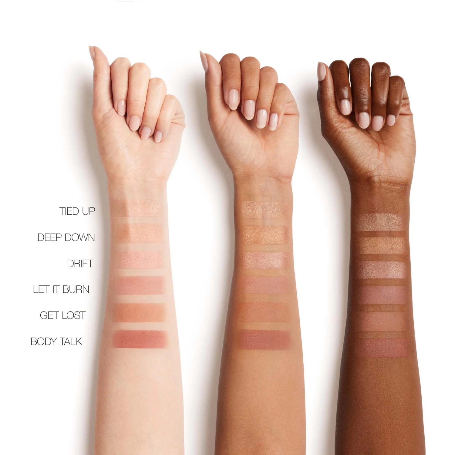 FILA INFERIOR (de izquierda a derecha): LET IT BURN (rosa suave satinado) GET LOST (melocotón nude satinado) BODY TALK (malva empolvado satinado)